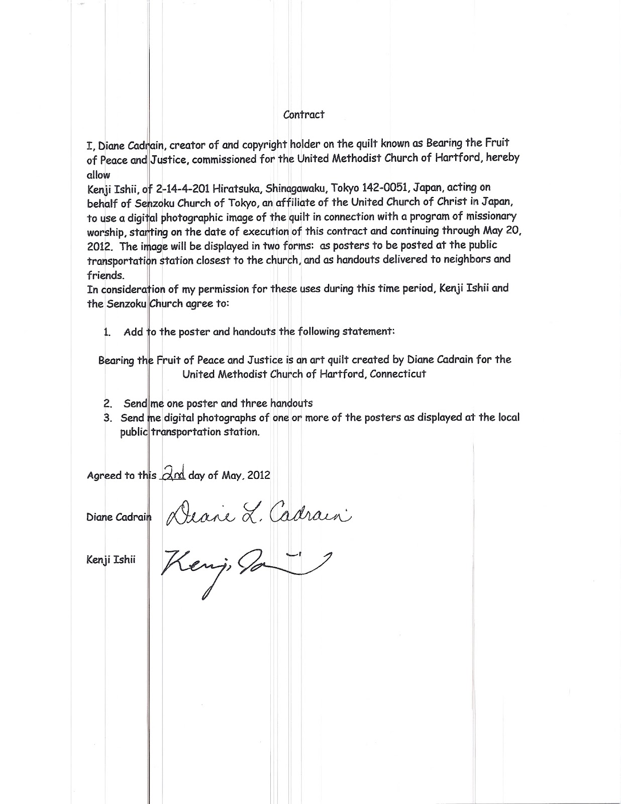 Once I was satisfied that this voice from Japan belonged to a real person, and an admirable one at that, I had to try to figure out the extent to which I had any rights to the image. I researched copyright law, and it turns out that although the United Methodist Church of Hartford owns the quilt, I own the right to the image. I immediately copyrighted it.